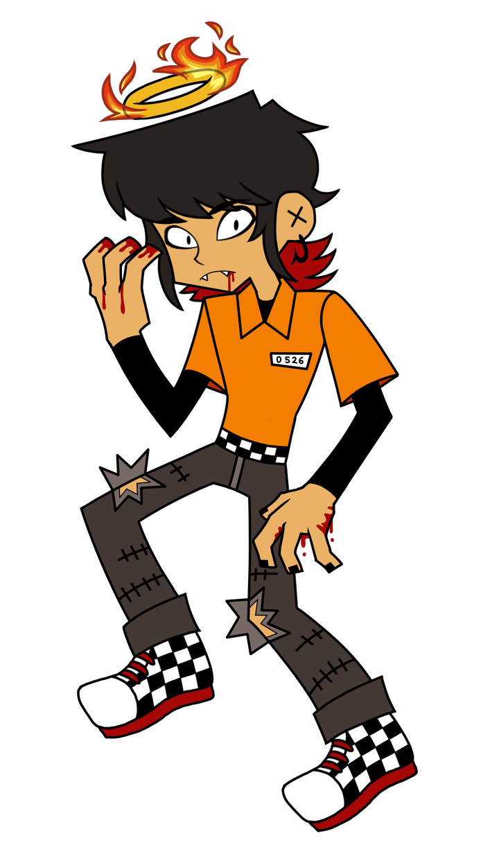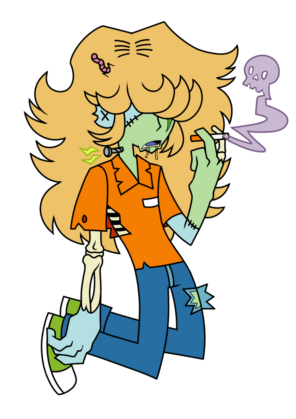 Dying before he could carry out his sentence, Zomboy was revived for just that. After his body was found a few weeks after his death, a long hex bolt was lodged into his neck and he was electrocuted back to life. Very little is known about his identity, and he's been at the school for over 20 years now, making him the "oldest" student. Every now and then he has to be electrocuted using alligator clips and jumper wires so he can retain his consciousness. Without it, he'll turn into a mindless "zombie" who goes around biting people. His speech always degrades the longer he goes without being electrocuted. Most of the time he'll communicate with sign language or grunts, but for the first few days after being electrocuted he can form a few sentences.Despite his nickname and appearance, he is not a zombie but more of a "Frankenstein." Despite this, he has the urge to bite people, but luckily those he bites don't have to worry about transforming into a mindless beast (only rabies). He is aware he's dead, has no qualms with smoking, and will typically go through three packs a day. Most students ignore him, and even the school's warden doesn't know who he is. Will he ever finish his sentence? Probably not.